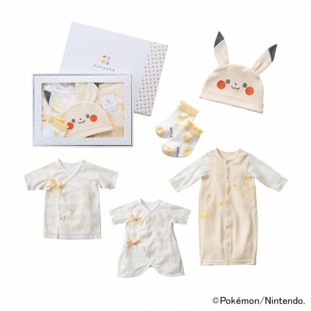 出産祝いにぴったりの、出産準備品セット。セットの内容は、短肌着にコンビ肌着、ドレス&カバーオール、ピカチュウの顔と耳つきの帽子、ソックス。