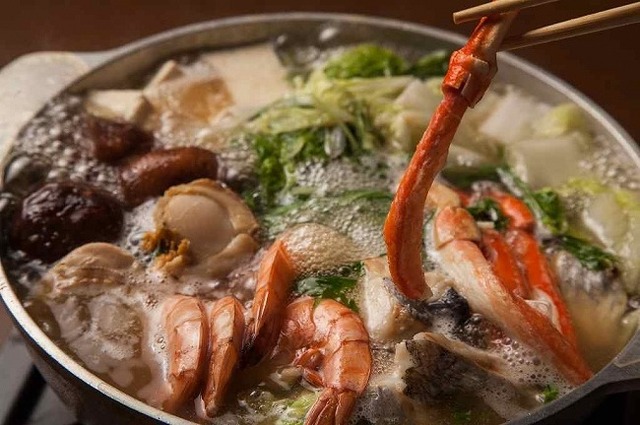 魚介(ホタテ、エビ、ホキ、あさり、カニ)と冬野菜が入った鍋の後に、魚介のエキスが染みでた出汁で、豚のしゃぶしゃぶが楽しめる鍋です。