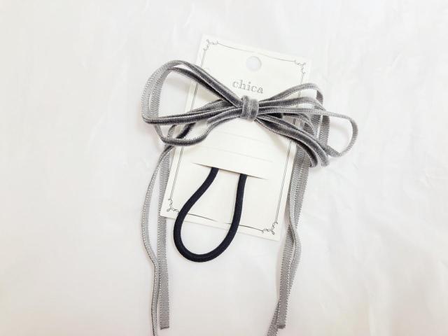 ヘアゴムにグレーのリボンがあしらわれています。少し光沢のある素材で、高級感のあるデザインになっています。