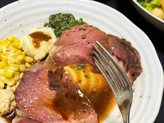 これもテイクアウトの醍醐味です。特製スパイスを塗って骨付きのままじっくりと焼き上げたローストビーフの断面も、なかなか日常的には拝めませんのでしっかりと目に焼き付けましょう!