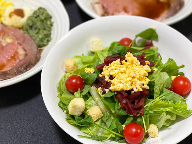 ウキウキしながら盛り付けます♪ローストビーフの厚みやその色に食欲がそそられまくります。