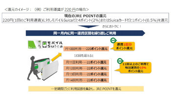 多様な通勤スタイルを応援する、紙の回数券に相当する新たなポイントサービスはJR東日本の在来線全てのSuicaエリアを対象に、同一運賃区間の利用が同一月内に10回で運賃1回分相当のJRE POINTを還元する。さらに、月11回以上の利用で1回ごとに運賃の10%相当のJRE POINTを還元する。