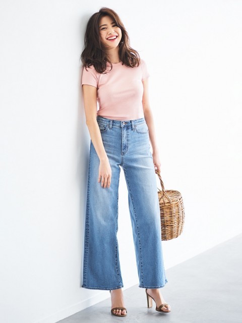 今年トレンドの花柄のふんわりロングスカートと合わせて、フィット&フレアのシルエットを作りましょう。サッシュベルトや太めのベルトを巻いて、ウエストマークすると、さらにスタイルアップして見えますよ。