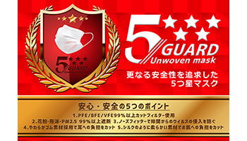 医療用メディカルマスク~5GUARDマスク~は、一般的なマスクよりも優れた、PFE・BFE・VFE99%以上遮断、花粉・飛沫などの99%カット、ノーズフィッターによるウイルス侵入ガード、耳が痛くなりにくいゴム素材の柔らかい耳ひも、シルクのような柔らかい素材のマスク。