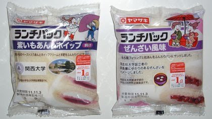 関西大学商学部は「紫いもあん&ホイップ」。学校のテーマカラー・紫紺(しこん。日本では昔から染め物などでも使われる色らしいです。)から食材を選ぶという作り方。同志社大学経済学部は「ぜんざい風味」。大学設立者の好きな食べ物だったらしいです。聞かなきゃ分からないところが好感を持てます。