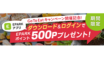 順番待ち受付・ネット予約が可能な「EPARK」で、Go To Eatキャンペーンの利用が便利になる「EPARKアプリ」を初回ダウンロード&ログインしたユーザーに、EPARKポイント500Pを付与するキャンペーンを実施している。期間は2021年1月31日まで。