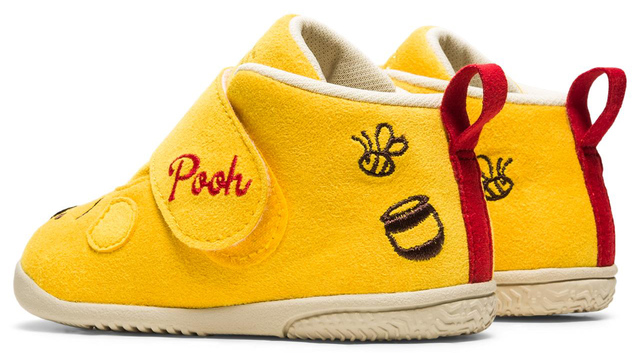プーさんカラーの黄色と赤で作られたシューズを履いたら、プーさんのように自由気ままに、初めてのあんよを楽しめそうです!!