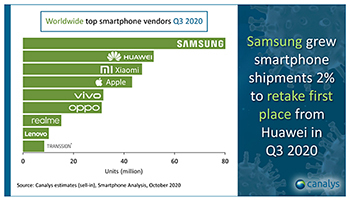 調査会社カナリスがこのほど発表した2020年第3四半期の世界のスマートフォン(スマホ)出荷台数で、中国のXiaomi(シャオミ)が初めて3位に入った。9月にiPhoneの主力製品を発売しなかったAppleは4位に後退した。