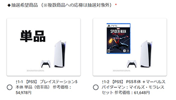 商品一覧には倍率表示もあり、PS5本体単品が「倍率高」、PS5本体+5年保証セットが「倍率低」、PS5本体 デジタル・エディション単品が「倍率最高」、PS5本体 デジタル・エディション+5年保証セットが「倍率高」となっている。申し込む際の参考にしたい。