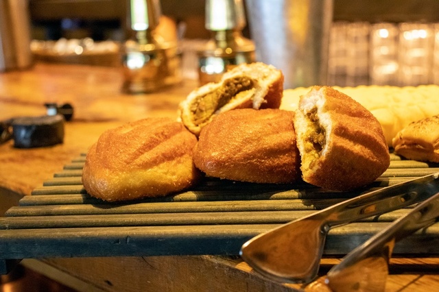 カレーパングランプリ4年連続金賞を取った、ラグビーの街“東大阪”生まれの、ラグビーボール型のカレーパン。中には中辛カレーとじっくり煮込んだゴロッと牛すじを包み込んだ、ボリューミーな一品です。