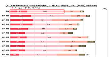 Go To Eatキャンペーンを利用してネット予約したランチに、誰と行ったかを尋ねた質問では、30代と40代の男性では4割以上が1人で利用していることが分かった。