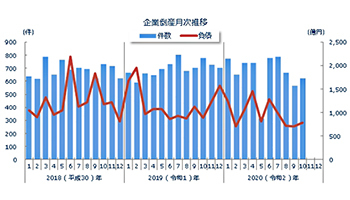 また、“巣ごもり需要”効果のあった飲食料品小売業(37→19件)などの小売業が84件(前年同月比30.5%減)で、6カ月連続で減少した。このほか、建設業105件(同13.2%減)が7カ月連続、製造業65件(同42.2%減)が6カ月連続、卸売業74件(同30.1%減)が2カ月連続、不動産業20件(同25.9%減)と情報通信業19件(同26.9%減)が3カ月ぶり、農・林・漁・鉱業7件(同30.0%減)と金融・保険業2件(同50.0%減)が2カ月ぶりに、それぞれ前年同月を下回った。一方、運輸業は20件(同53.8%増)で、3カ月ぶりに前年同月を上回った。