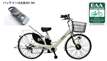 電動アシスト自転車 EVA PLUSは、電動アシスト自転車を初めて検討する人でも購入しやすい6万円台の価格を実現しながら、バッテリ容量は充実の8.5Ahを搭載し、1回の充電で最大約32kmの走行が可能となっている。