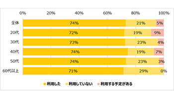 調査の結果、「Go To Eatキャンペーン」を利用した人は74%となった。このうち、週1利用は全体の約3割、週2-3回利用が26%。週6~7回利用という人も7%いた。また、60代以上の人では週4-5回利用が21%を占めていた。