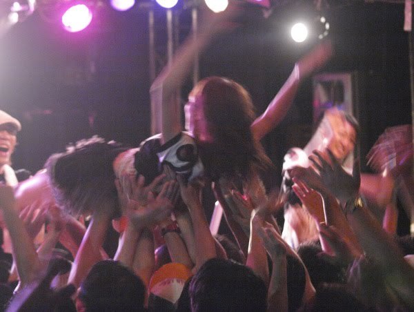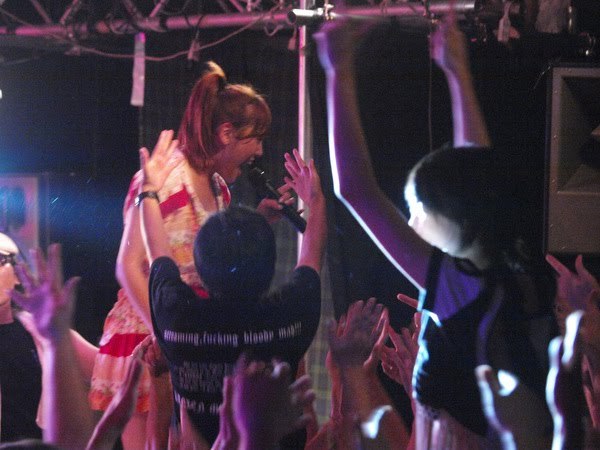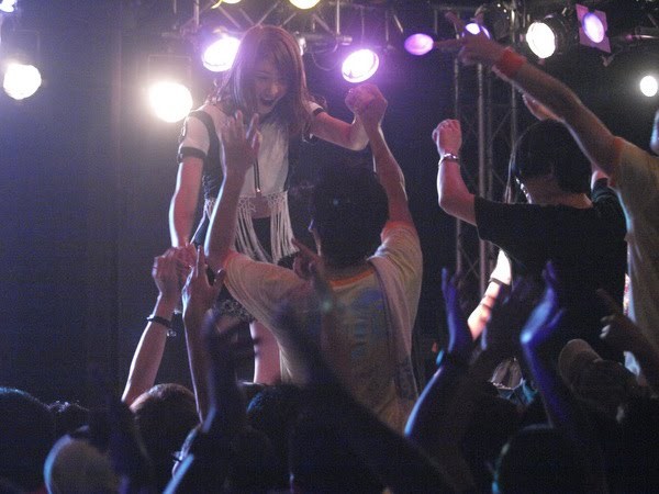 さてさてラストスパートでございます。絆のアップテンポなナンバー、『交-Majiwari-』でガンガンに盛り上げたり、しず風絆全員集合で『ドキドキパニック』に『Pinkのロケット☆彡』という、もうコレで暴れないでどこで暴れるんだ!という大騒ぎソングを次から次に立て続け。サーフとか当たり前状態の中で、晴子さんがステージにいない!とか思ってたらいつの間にかフロアに降りて周囲のファンとハイタッチしまくって、いつの間にか持ち上げられてステージに向かっていくとか、そういうもう誰が演者で誰が観客だかわからないっていうかもうそんなの関係ないじゃん!楽しもうよ!というわちゃわちゃタイムがはじまっちゃいまして、見ていてホント幸せな気分になりました。