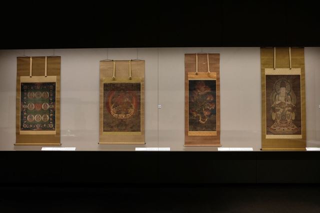 左から重要文化財《金剛界八重一尊曼荼羅》 鎌倉時代 13世紀、重要文化財《愛染明王像》 鎌倉時代 14世紀、重要文化財《愛染明王像》 鎌倉時代 14世紀、重要文化財《大威徳明王像》 鎌倉時代 13世紀、重要文化財《大威徳明王像》 鎌倉時代 13世紀、重要文化財《大日如来像》 平安時代 12世紀。すべて重要文化財!