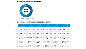 さらに、新型コロナウイルス感染症の感染拡大の影響で、約半数、48.7%「老後の不安が増えた」と回答。新型コロナウイルス感染症によって生じた、新たな老後への不安としては、「お金」や「健康」に次いで、20~30代では「仕事・学業」、40~50代では「両親の介護」がそれぞれ3位となった。