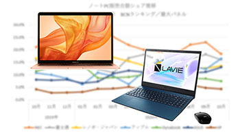 全国の家電量販店やECショップでPOSデータを集計する「BCNランキング」によると、10月におけるノートPCの販売台数前年同月比は155.5%と、前月の62.2%から急上昇した。前年同月が増税の反動を受け、販売が落ち込んだことで相対的に前年比が上がったこともあるが、根強いテレワーク需要で各社ともに好調を維持している。