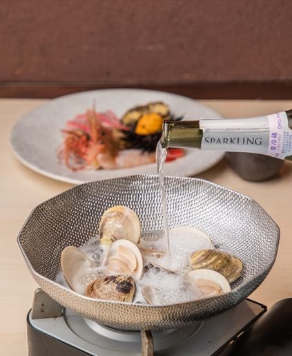 スパークリング日本酒を鍋に注ぎ酒蒸しにした蛤の旨味に雲丹を加えた濃厚な出汁で、雲丹やあわび、ぼたん海老などの海鮮が楽しめます。〆にはチーズを加えた雲丹チーズリゾットが用意されます。