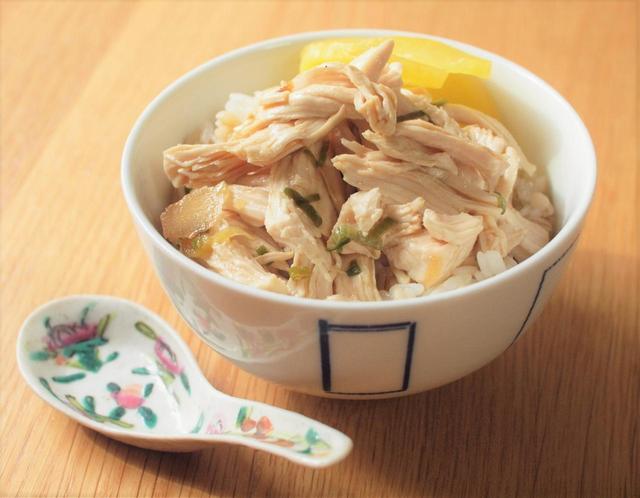 手で細く裂いてご飯に乗せたら、醤油でほんのり味付けした鶏肉の茹で汁と、先に作っておいた鶏油を回しかける。