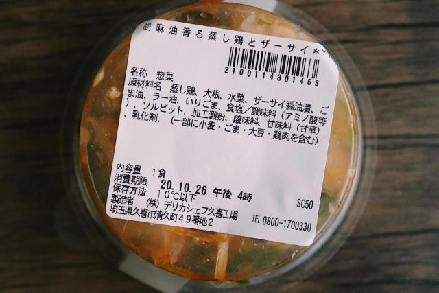 原材料は蒸し鶏、大根、水菜、ザーサイ醤油漬。ごま油やラー油などで味付けされています。カロリーは112kcal。あともう一品にはちょうど良いですね。