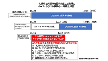 札幌市と大阪市を目的地とする旅行の当面の措置内容は次の三つ。(1)11月24日~12月15日24時までに出発する旅行の新規予約でGo To トラベル事業の適用を一時停止、(2)12月2日0時~15日24時までに出発する既に予約済みの旅行もGo To トラベル事業の適用を一時停止、(3)11月23日24時までにGo To トラベル事業の対象として予約した旅行は、11月24日~12月3日24時までに旅行会社にキャンセルを申し出る――。