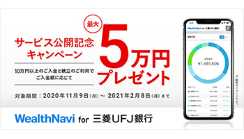 ウェルスナビは、ロボアドバイザー「WealthNavi(ウェルスナビ) for 三菱UFJ銀行」のサービス公開を記念し、最大5万円をプレゼントするキャンペーンを実施している。