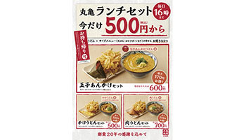 丸亀製麺は、うどんと天ぷら、おむすび、いなりの中から好きなものを二つ選べる「丸亀ランチセット」を11月26日から店内限定から持ち帰り対象商品に変更して販売を開始した。丸亀ランチセットは、11月24日~12月28日の開店から16時までの期間限定で発売している。