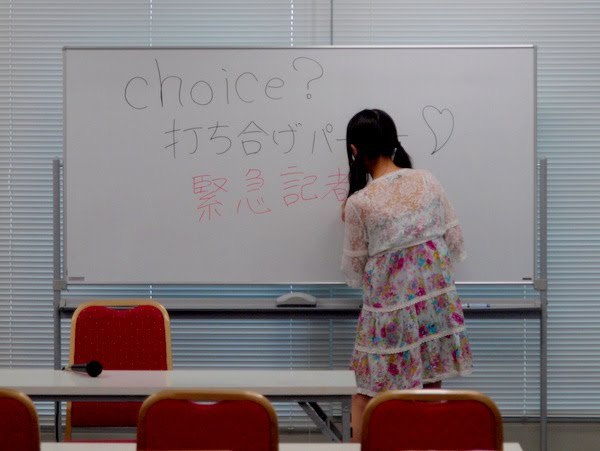 さてさて、お次は会場を移動しまして、ワンマン大成功の報告を緊急記者会見!というテイのファンイベントでございました。ここからウレぴあ音楽担当、編集部Sさんも合流であります。くるみんが最初にホワイトボードに「打ち合げパーティ(はぁと)」って書いてたのがかわゆすぎました!くるみんそれを言うなら打ち上げや!渋谷のカンファレンスルーム的なところで開催されて、さらには台置きのマイクがあったりして、ホントに記者会見っぽいんだけど記者役はファンのみなさん!というのがオモチロでしたね。記者の皆さんから質問を受け付けます!みたいな感じで質問タイムを取ったりもしていました。