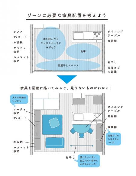 例えばくつろぎゾーンの中にキッズコーナーがあるとします。そこには、おもちゃを収納する場所、お絵かき用のテーブル、プラレールを広げられるスペースが必要…などと考えていくことで、必要な家具が見えてきます。