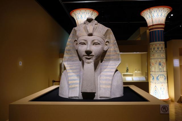 額には聖蛇ウラエウス、アゴには付け髭を装着したハトシェプスト女王の姿。ハトシェプスト女王の葬祭殿の参道と中庭に置かれていた。