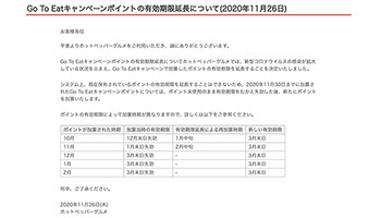 予算到達のために新たなポイント付与は既に終了しているが、東京都、大阪府、埼玉県では、11月27日から獲得したポイントを利用した飲食について極力利用を控えるよう要請されている。リピート需要を喚起するため、もともとの設定が短すぎたともいえるが、こうした状況でホットペッパーグルメがポイントの有効期限を延長することは、ユーザーの立場に立った救済措置ではあるだろう。(BCN・嵯峨野 芙美)