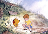プーとお別れするクリストファー・ロビンと、いまいち理解できていないプー。