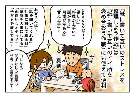 箇条書きにした文章を見ると言葉で言われる時の不快感が無く、素直に旦那の気持ちが理解できたし、旦那も自分の気持ちが整理されて互い冷静さを取り戻していました。