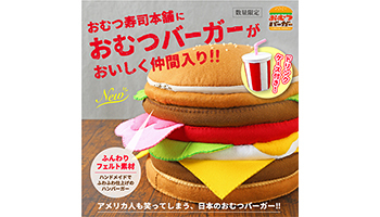 今回発売したおむつバーガーは、おむつ寿司のルーツである「おむつケーキ」の発祥の地である米国になじみのあるハンバーガーを模した出産祝いギフト。フェルト生地で作られており、紙おむつ・おしりふき・おもちゃ入れ、ままごと遊びなどに使える。