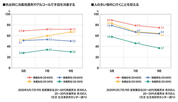 「マスクを洗濯・手入れして繰り返し使う」は、緊急事態宣言前後の使い捨てマスクの品薄から、「布製マスク」が広まったことや、「マスクの洗い方」の情報も増えたことなどが影響していると考えられる。布製マスクは、手作りの楽しさや見た目のおしゃれ感はもとより、暑い夏でもほぼ毎日マスクが必要となった「新しい生活様式」で、経済性やつけ心地の面でも歓迎され、定着してきたようだ。