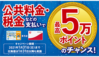 ローソンは12月1日~2021年1月31日の期間で「最高5万ポイントが当たる!公共料金、税金などが対象の収納代行」キャンペーンを実施している。ローソンの店頭で公共料金や税金などの支払票で1枚2500円以上を支払う際、Pontaカードやdポイントカードを提示すると、抽選で最高5万ポイントが当たる。なお、北海道は1月31日以降も実施する。