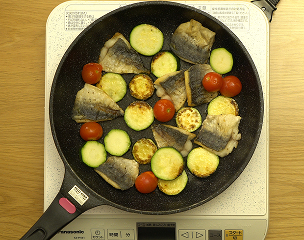 ⑤①に米粉をまぶし、フライパンに油を入れて温め、ズッキーニ、トマトと蒸し焼きにする。