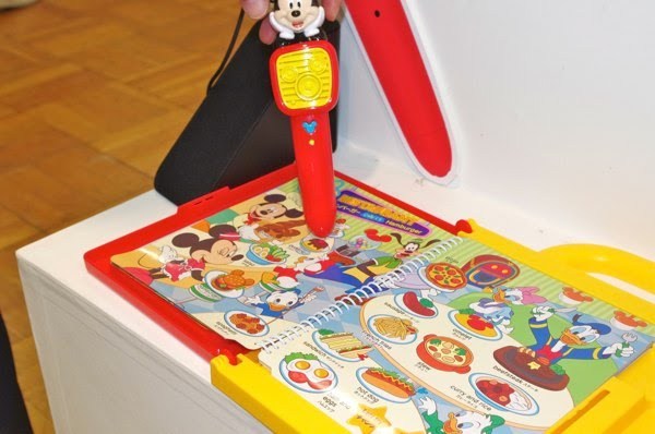 一見普通の本。そこに描かれたイラストや文字を、ペンでタッチすると音声が流れる。英語、日本語の切り替えもできる。時間、挨拶、歌まで幅広い内容を網羅しているので、子どもを長い間飽きさせないだろう。持ち運びもしやすい。