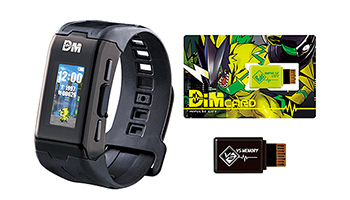 また、別売のカード型連動アイテムを使用すると、さまざまなデータを追加可能。「バイタルブレス デジタルモンスター」の場合は、本体に付属する「Dim カード」を読み込ませることで、バイタルブレス内にデジモンの卵「デジタマ」が出現。腕に装着し、毎日の活動やエクササイズなどさまざまなミッションを達成することで育成することができる。デジモンの進化は、バイタル値、勝率、ミッションの達成数によって変化する。