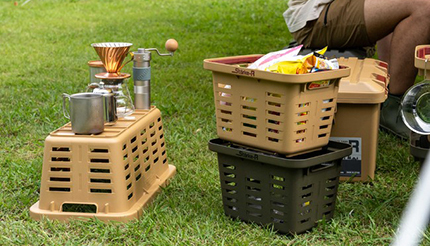 アウトドア道具の長物から小物までスマートに整えることができ、車の中でも自宅でもさまざまな物をすっきり収納できる。買い物のエコバスケットとしても使いやすい。素材に超高耐衝撃性コーポリマーを使用。衝撃に対して優れた耐久性と耐候性が処方されておりマイナス20°から100°の環境にも対応している。ほとんどの化学薬品、オイルにも耐え、軽量の素材となっている。