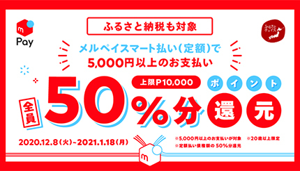 メルペイが12月8日~2021年1月18日の期間で開催しているメルペイスマート払い(定額)で5000円以上支払うともれなく50%分のポイントが還元される「年末年始まるっと還元キャンペーン」では、ふるさと納税も対象になっている。ポイントの上限は1万ポイント。