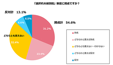 20~39歳の未婚男女2400人に対して、「選択的夫婦別姓」制度への賛否を尋ねたところ、「賛成」(31.2%)と「どちらかと言えば賛成」(23.4%)を合わせた賛成派は54.6%に達した。