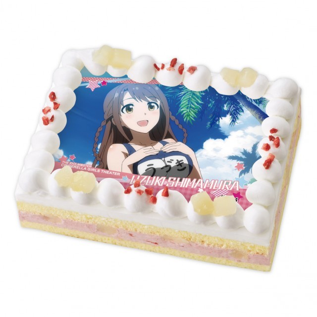 デザインは島村 卯月、渋谷 凛、本田 未央、双葉 杏、神崎 蘭子の全5種類をラインナップ。ケーキにプリントされるイラストは、それぞれを象徴するようなカットが選ばれており、島村卯月だけはスク水を着たリアル頭身ver.のイラストとなっています。