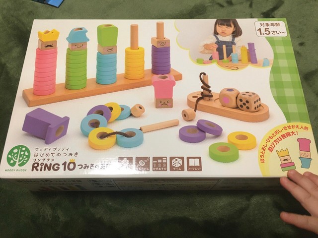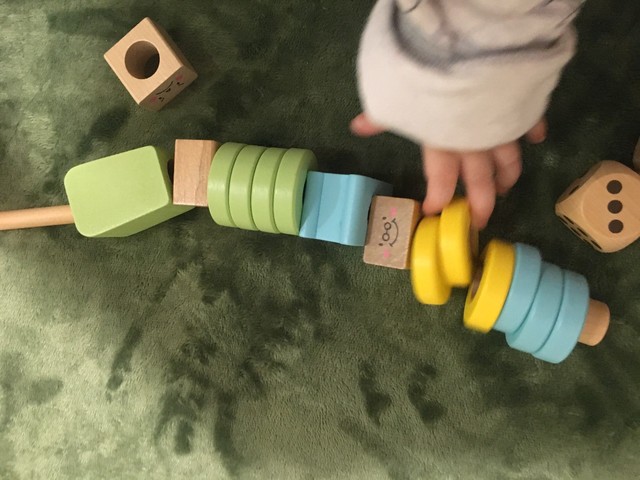 積み木が通せる紐も2本付属していて、棒に刺すだけではなく紐通しも楽しめるのも良いなと思いました。紐通しは指先を使って慎重に行うモンテッソーリ教育でも重要視される作業です。
