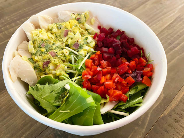 ACTIVEの薩摩悠然鶏のチキンボウルではタンパク質25g以上が摂取できます。ROOTRICE®の上にメインディッシュを乗せてボリュームたっぷり、色も鮮やかです。