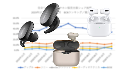 メーカーシェアでは、アップルが3割強を占めてトップをキープ。ただ、5月をピークに徐々に落ちており、競合各社の成長がうかがえる。2番手以降は、ソニー、JVCケンウッド、オーディオテクニカ、ボーズの順で並ぶ。いずれも、販売台数前年比ではアップルを上回っている。
