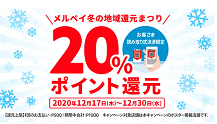 スマートフォン(スマホ)決済サービスのメルペイは12月17~30日の期間、「メルペイ冬の地域還元まつり」として大阪府と新潟県の主要地域の対象加盟店でメルペイコード決済を使って支払うと、20%ポイント還元するキャンペーンを開催する。