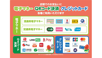 スマホ決済は、先行して導入していた「LINE Pay」のほか、「PayPay」「楽天ペイ(アプリ決済)」「メルペイ」「au PAY」「d払い」「Alipay」「WeChatPay」が使えるようになった。電子マネーは、「nanaco」「WAON」「楽天Edy」「iD」「QUICPay」と「Suica/PASMO/TOICA/ICOCA」に対応する。