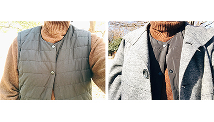 ヒートベストはどうだろうか。サイズはMとLの2サイズ。筆者は、155センチと小柄な方なのでMサイズを選んだ。ユニクロの「ウルトラライトダウンコンパクトベスト」レディースのMサイズよりも、一回り大きいといった感じだろうか。
